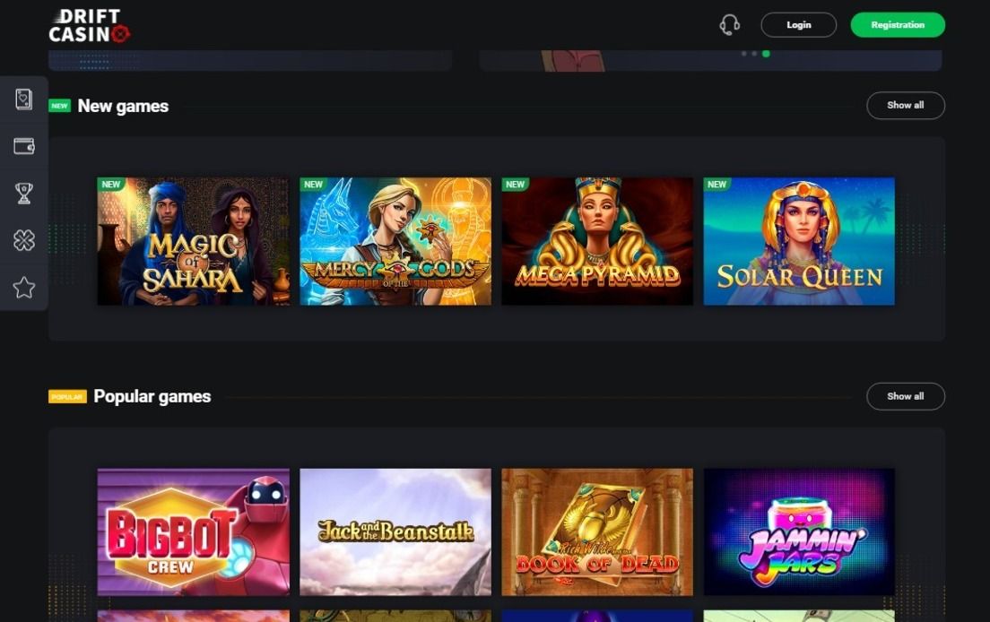 Е, ревюто на Drift Казино все пак няма да бъде пълно без описанието на игрите, които казиното предлага. Има 2 раздела - казино игри и спортни залагания. Нека разгледаме първия. Той има 9 категории, включително популярни и нови игри, обикновени и смарт слотове, маси, Live.